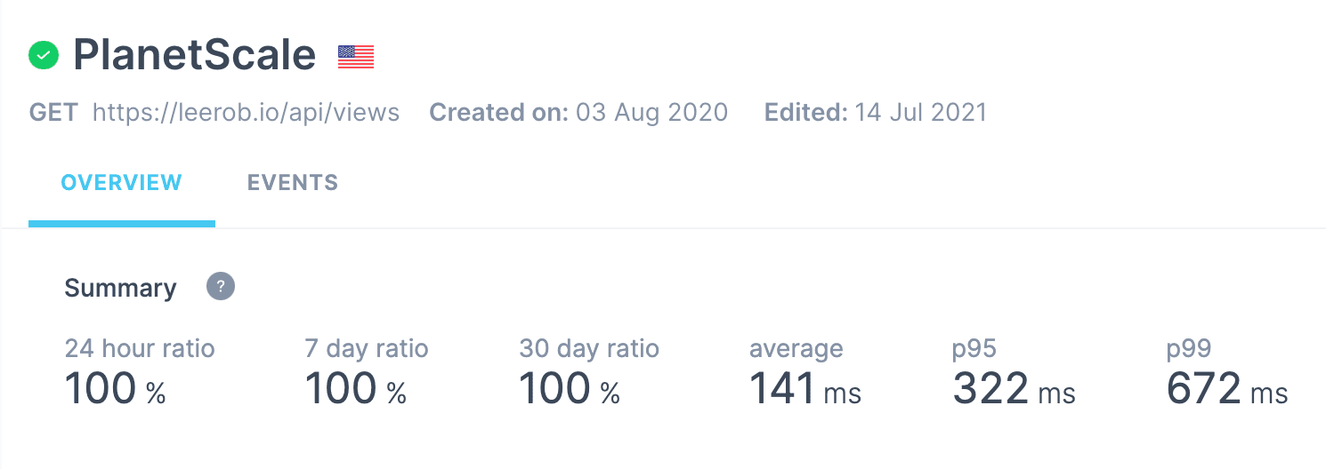 I've been monitoring the performance of my production APIs connecting to PlanetScale with Checkly. Checkly allows me to set alerts if there's downtime or if performance decreases below my accepted threshold. For the last week, I've seen latency of ~150ms for my Next.js API Routes, deployed as serverless functions on Vercel in us-east.